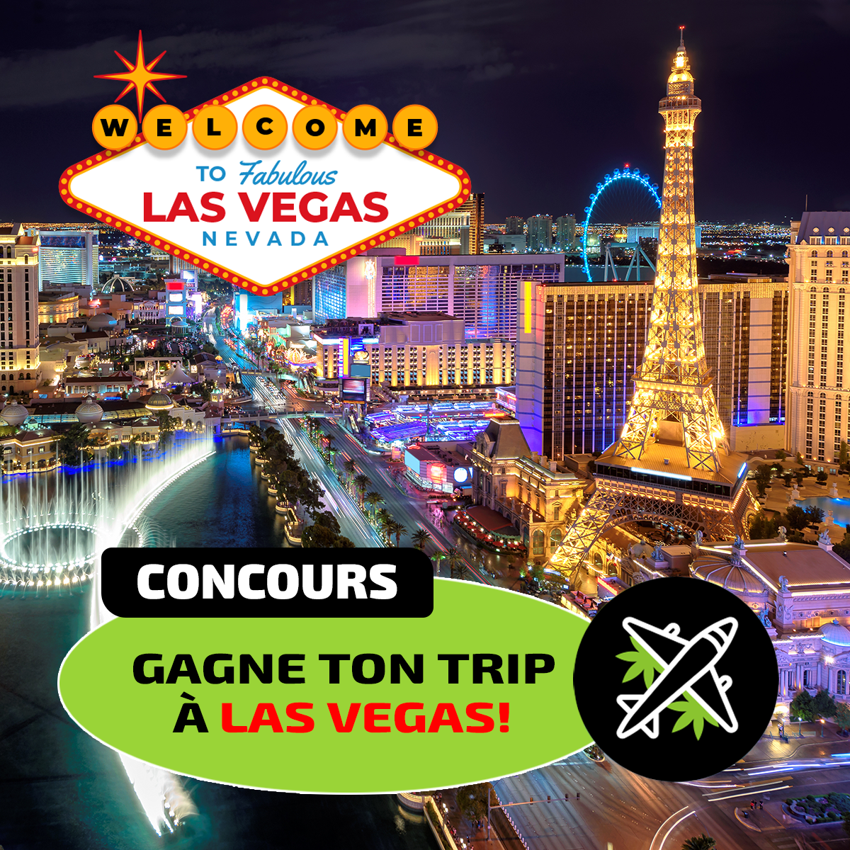 Envole-toi pour un séjour inoubliable à Las Vegas avec la personne de ton choix. Du 7 au 9 août 2026, vis l’expérience ultime dans la capitale mondiale du divertissement. Entre casinos mythiques, spectacles, ambiance électrique et nuits légendaires, découvre l’énergie unique de Vegas. Trois jours de fête et de liberté. 🎰🌿✌️😎